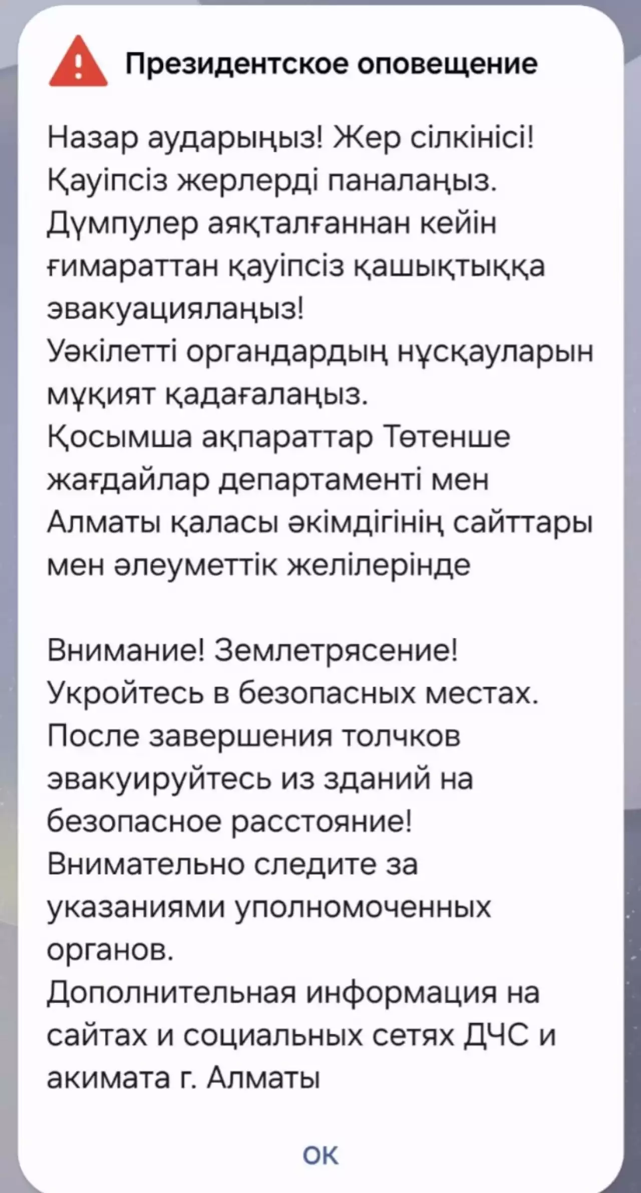"Мәліметтер нақтыланып жатыр. Алдын ала ақпарат бойынша сейсмикалық жағдай Алматы қаласында тіркелді", - деп жазылған хабарламада.